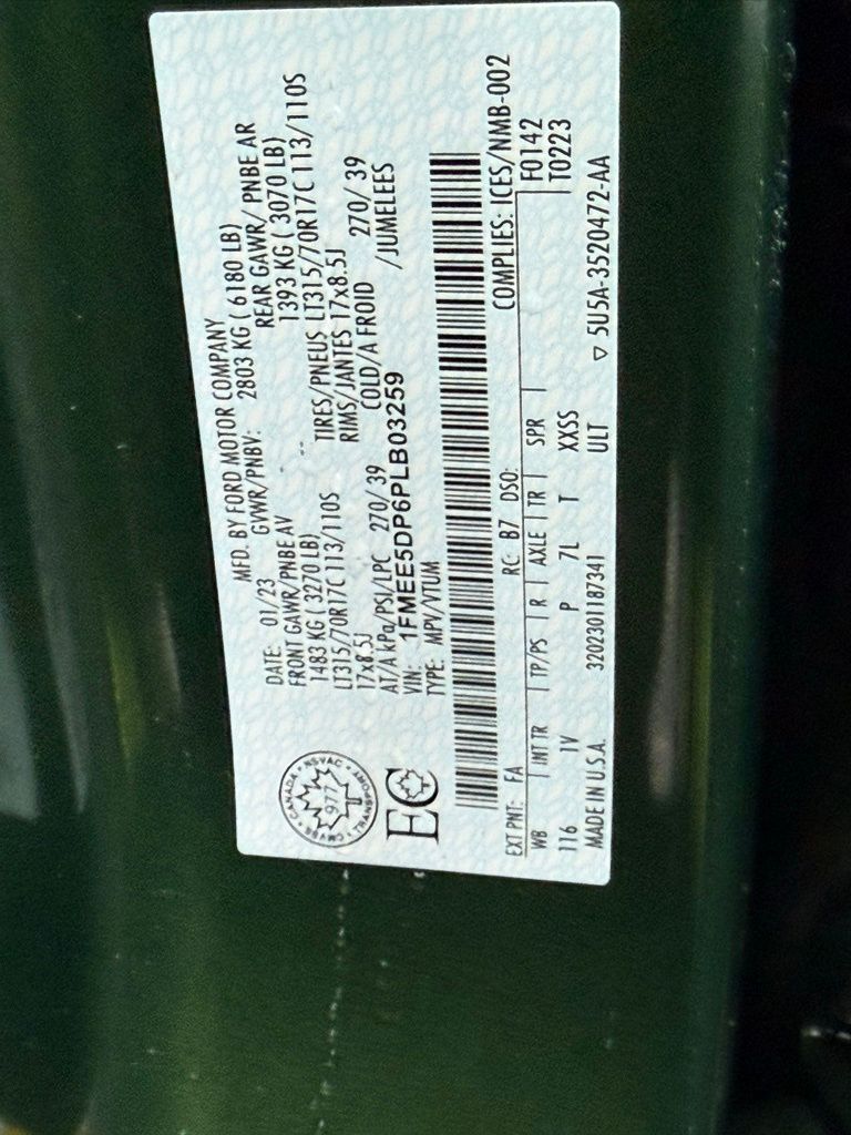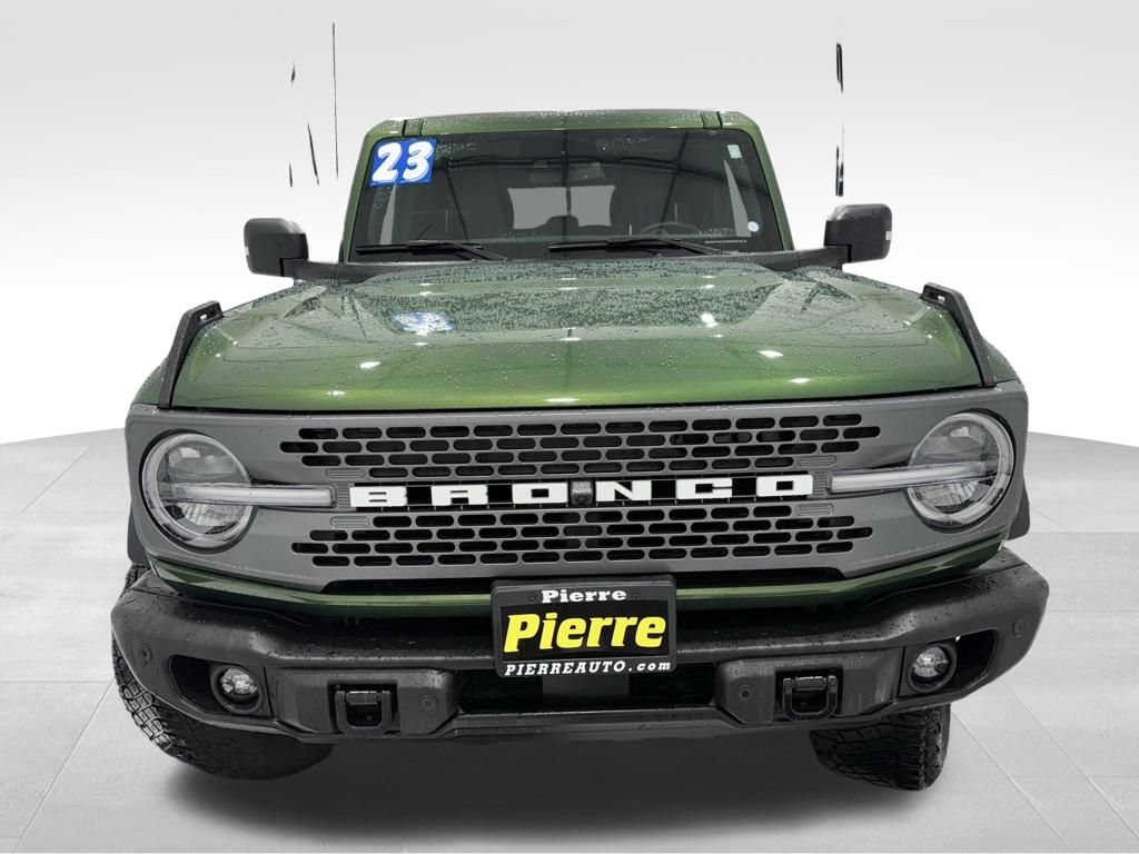 2023 Ford Bronco 4-Door Advanced 4x4: ** Eruption Green Metallic exterior with Black marine-grade vinyl seats ** 2.7L EcoBoost V6 engine ** 10-speed automatic transmission ** Sasquatch Package with 35 mud-terrain tires, 17 black beadlock-capable alloy wheels, high-clearance fender flares, and locking front and rear axles ** Mid Package with Dual-Zone Climate Control, Remote Start, Heated Front Seats, and 12 LCD Touchscreen ** Modular Hardtop with sound-deadening headliner ** Rock Rails and Floor Liners ** Ford Co-Pilot360 with Blind Spot Information System, Lane Keeping System, and Pre-Collision Assist ** Upfitter Switches and Auxiliary Power ** Terrain Management System with G.O.A.T. Modes ** Trail Control and Trail Turn Assist ** Rearview Camera ** Keyless Entry with Push Button Start ** FordPass Connect with Wi-Fi Hotspot ** LED Signature Lighting ** Tow Hooks and Heavy-Duty Front Bumper ** Canadian Market Vehicle **